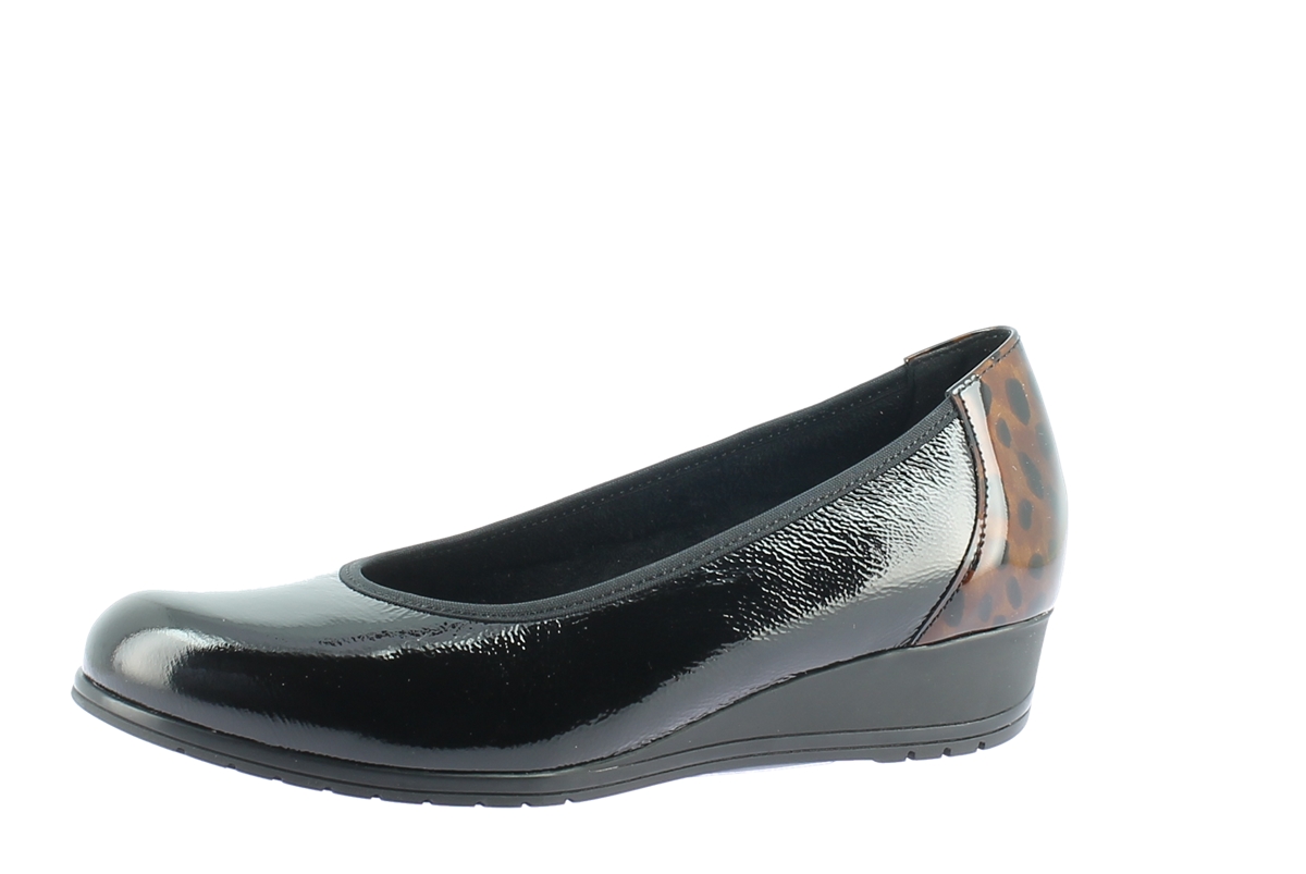 Décolleté en cuir vernis, semelle amovible.