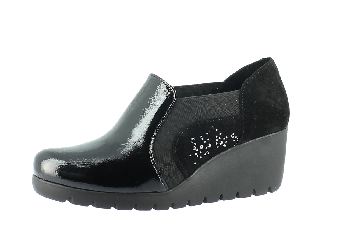 Décolleté en cuir vernis, semelle amovible.